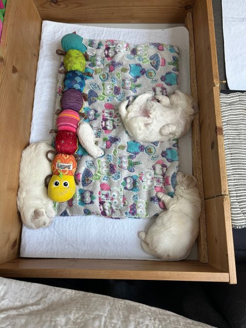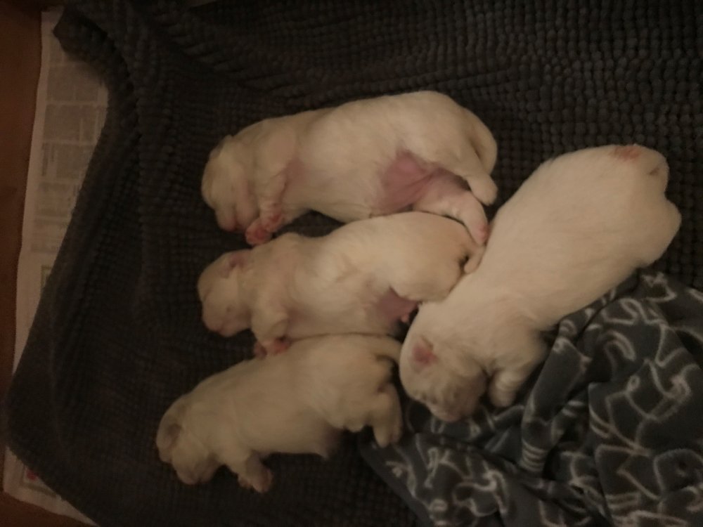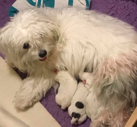 Coton Langelands Freja nedkom i dag med L-kuldet: 6 hvalpe - 5 hvide tæver og 1 hvid han. Faderen er Otieno.