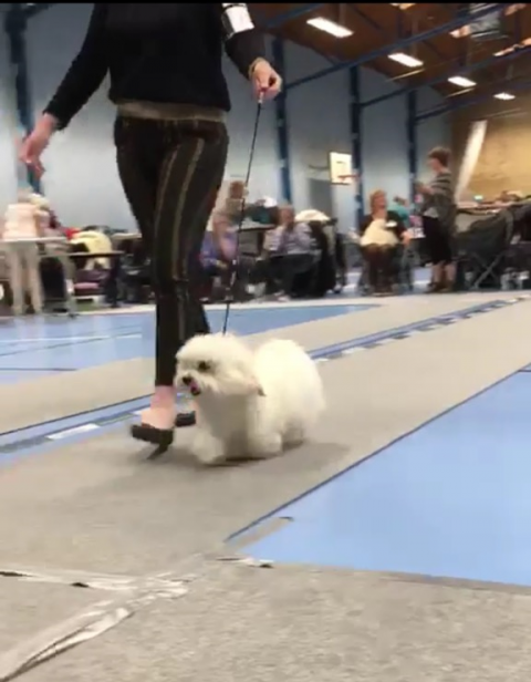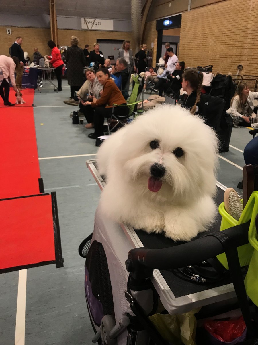 I´m Lucky på hundeudstilling for første gang. I Herning blev han vinder i klassen Baby-han med rigtig flot kritik.