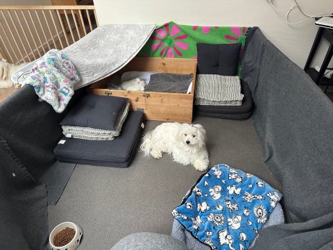 Så er fødekassen kommet væk - og der er nu dejligt med plads til hvalpenes små løbeture.