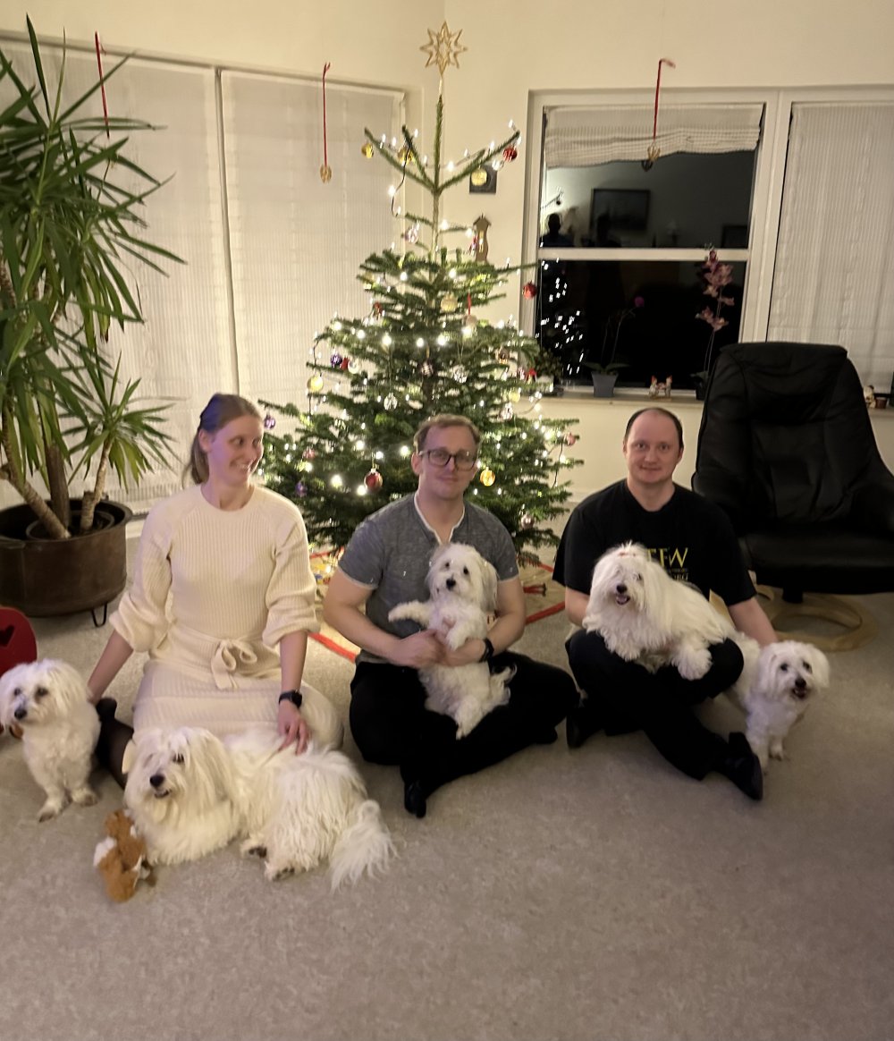 Mens Envy tager sig af det nyførte kuld hvalpe - født ved 6-tiden om morgenen - er den øvrige flok samlet ved juletræet.