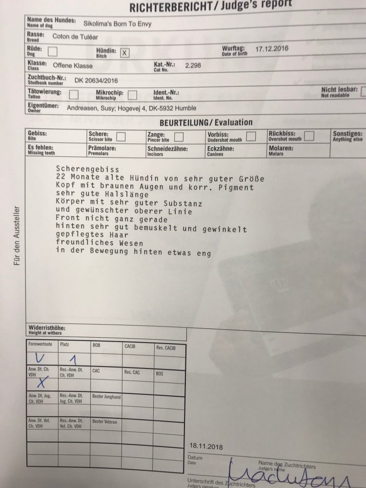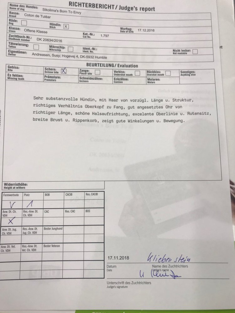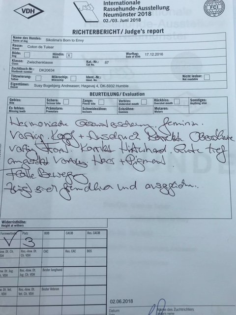 Bedømmelse: very active, sound, good breed type, excellent bones, good muscles, nice coat, correct structure of coat, nice feminine head, correct proportions of head, excellent pigmentation, siccors bite, typical correct top line and tail set, good front, front legs standing out, good angulations, moved free