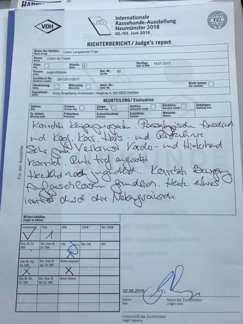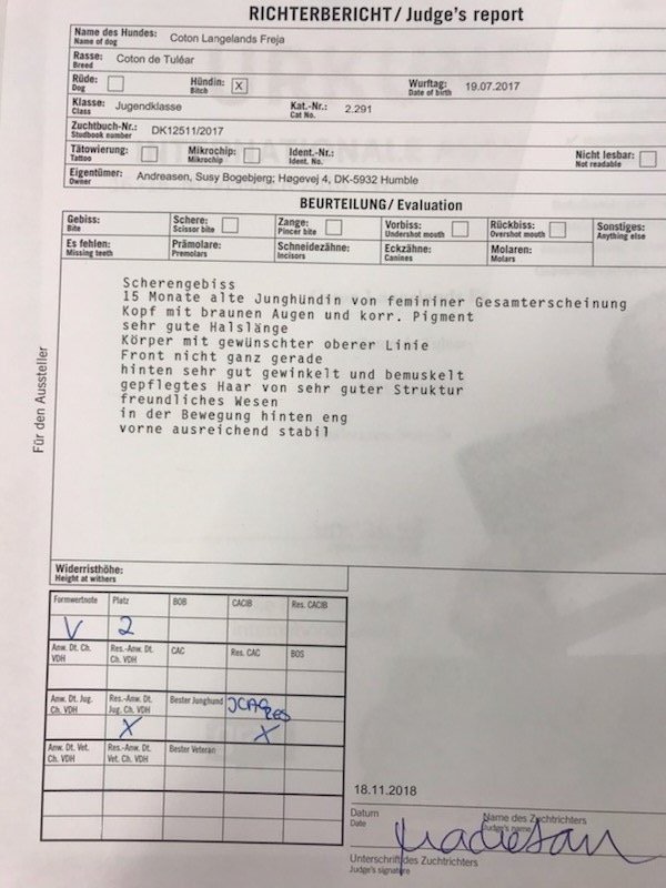 Freja deltog i Juniorklassen og fik præmieringen Exc., Plac 1, CK, 1 BTK, CERT, Jun.CERT, BIK, BIM