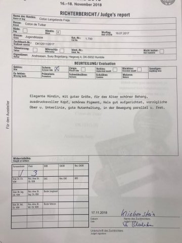 Bedømmelse: dmærkt type storleg og proportioner, bra hoved velformede øgon som kunne være mørkere, godt bid underkæben kunne være bredere lovende forbryst frembenene kunne være rakere, bra hals og skuldre, brystkorsdybde og længd, vel affaldende kryds velvinklat bag, rør sig tæt bag, vel fraa sidan.