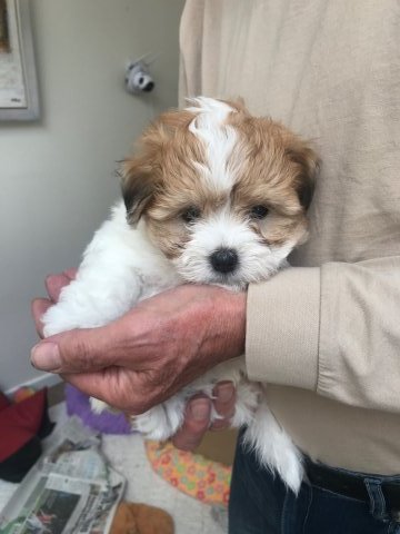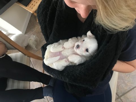 Hvalpe 5 uger - og så klædt på til morgentur på terrassen